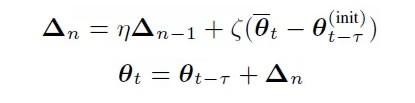 在基于 BMUF 的訓練框架下,假設我們總共有 N 個并行工作機,一個工作機可以是一塊或多塊 GPU 卡,也可以是一個計算節點。給定一個包含 Nτ 個 minibatch 的訓練數據子集,首先我們將這些數據均勻分布到 N 個并行工作機,每臺工作機獲得 τ 個 minibatch。從一個共同的初始模型 θ_(t-τ)^((init)) 開始,N 個工作機獨立更新各自的局部模型 τ 步,得到 {θ_(t,1),θ_(t,2),…,θ_(t,N)},對局部模型取平均得到 θ ̅_t。這一過程稱之為數據塊內并行優化(Intra-Block Parallel Optimization, IBPO)。與直接將 θ ̅_t 作為全局模型不同,BMUF 技術將歷史更新信息與當前更新信息結合,得到全局模型: