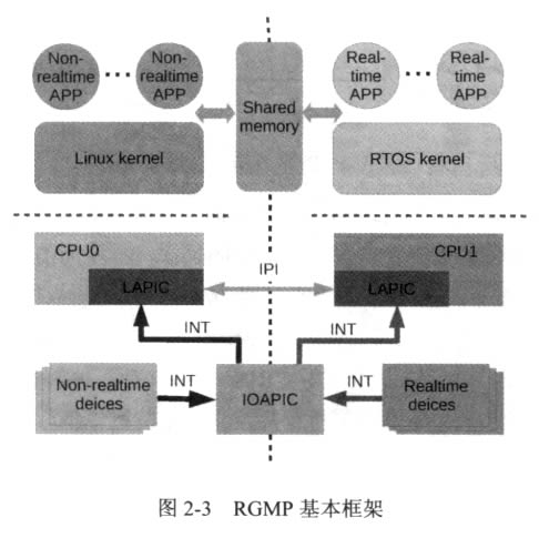 RGMP 是一個(gè)利用多核架構(gòu)實(shí)現(xiàn)的實(shí)時(shí)與非實(shí)時(shí)操作d立運(yùn)行的混合操作 系統(tǒng)框架,如圖2-3所示。通用操作系統(tǒng)(Linux) 和實(shí)時(shí)操作系統(tǒng)(RTOS) 在 各自的 CPU 上d立執(zhí)行。I/O 設(shè)備被分成實(shí)時(shí)設(shè)備和非實(shí)時(shí)設(shè)備,分別被實(shí)時(shí) 操作系統(tǒng)和非實(shí)時(shí)操作系統(tǒng)控制。中斷控制器被用作中斷路由器,將兩種設(shè)備 的中斷信號(hào)路由到相應(yīng)的操作系統(tǒng)。其中, RTOS 接受實(shí)時(shí)中斷,如電機(jī)驅(qū)動(dòng)、 傳感器等產(chǎn)生的中斷信號(hào);Linux 接受非實(shí)時(shí)中斷,如人機(jī)交互、顯示等中斷信 息。實(shí)時(shí)操作系統(tǒng)和通用操作系統(tǒng)都完全控制自己的 CPU, 所以沒有多余的軟 件層需要介入到操作系統(tǒng)和硬件之間。硬件中斷被每個(gè)操作系統(tǒng)直接處理。同 時(shí)各個(gè)操作系統(tǒng)d立運(yùn)行在各自的CPU 上不僅解決了CPU 共享問題,還能確保 操作系統(tǒng)之間不會(huì)相互影響。
