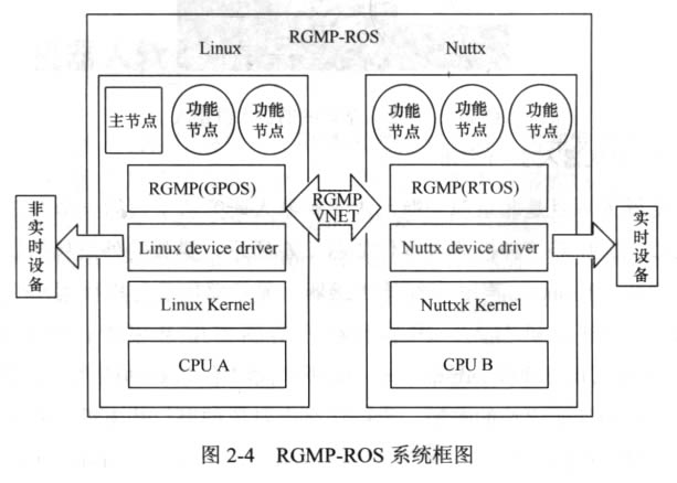 RGMP-ROS的系統(tǒng)框圖如圖2-4所示,整個(gè)機(jī)器人混合操作系統(tǒng)由兩個(gè)部分組 成:一個(gè)是安裝在Linux 上的標(biāo)準(zhǔn)ROS 系統(tǒng),另一個(gè)是運(yùn)行在實(shí)時(shí)操作系統(tǒng)Nuttx 上的實(shí)時(shí)ROS 系統(tǒng)。我們將運(yùn)行在Linux 上的ROS 功能節(jié)點(diǎn)稱為非實(shí)時(shí)ROS 節(jié)點(diǎn), 運(yùn)行在實(shí)時(shí)系統(tǒng)上的ROS 節(jié)點(diǎn)稱為ROS 實(shí)時(shí)節(jié)點(diǎn),它們運(yùn)行在各自的操作系統(tǒng)之 上。實(shí)時(shí)與非實(shí)時(shí)節(jié)點(diǎn)之間通過RGMP 提供的VNET 管道進(jìn)行通信。實(shí)時(shí)ROS 節(jié) 點(diǎn)運(yùn)行在Nuttx 之上,能夠通過標(biāo)準(zhǔn)的ROS 通信協(xié)議實(shí)現(xiàn)實(shí)時(shí)節(jié)點(diǎn)與實(shí)時(shí)節(jié)點(diǎn)、實(shí) 時(shí)節(jié)點(diǎn)與非實(shí)時(shí)節(jié)點(diǎn)之間的通信,并且傳遞符合ROS 協(xié)議規(guī)范的消息。實(shí)時(shí)節(jié)點(diǎn) 通過Nuttx 驅(qū)動(dòng)與Nuttx 系統(tǒng)內(nèi)核和實(shí)時(shí)系統(tǒng)掛載的外部設(shè)備進(jìn)行交互,以達(dá)到控 制實(shí)時(shí)設(shè)備的目的。為了保證實(shí)時(shí)性,GPOS 與 RTOS 各自擁有d立的外設(shè)。