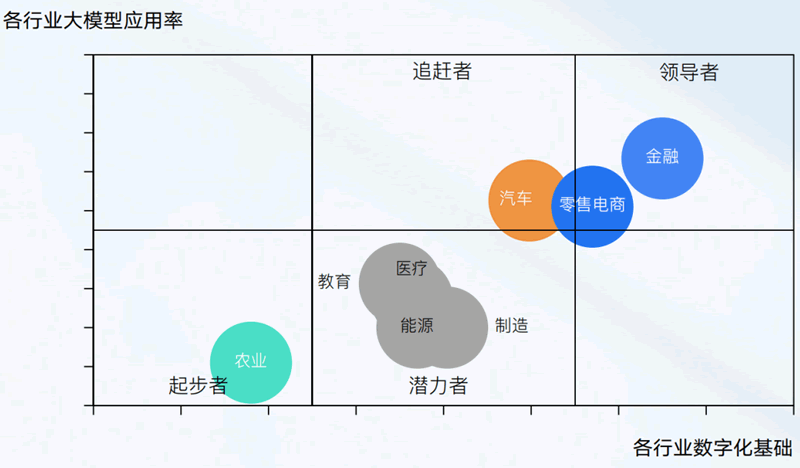但另一組數據更值得玩味:金融、零售電商、汽車三大行業,已悄然躍入"領導者"象限,其大模型應用率與數字化基礎呈現強正相關。而農業、教育、能源等行業,仍在"起步者"與"潛力者"區間徘徊。